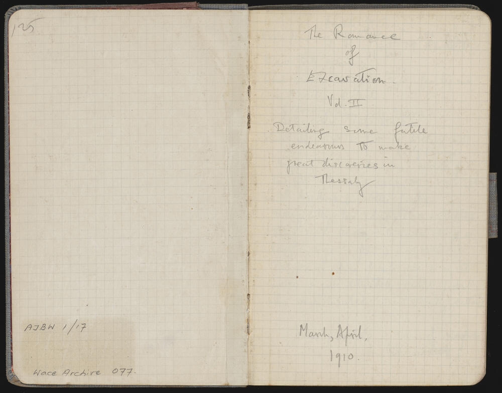 The title and sub-title of one of these notebooks, ‘The Romance of Excavation: detailing some futile endeavours to make great discoveries in Thessaly’, was a private joke for Wace alone, never to be formally published in any academic text. It suggests Wace’s exuberant delight and enthusiasm for exploring both the ancient and the contemporary landscapes of Greece. The notebooks also detail inscriptions he encountered by chance on his travels and jottings on modern Greek dialect. Wace is perhaps best known as the British excavator of Bronze Age Mycenae. However, his early field notebooks are testament to his deep interest in earlier Greek prehistory, which abided with him for a lifetime. In 1956, the year before his death, Wace visited Volos Museum, and corresponded on Neolithic finds with the archaeologist Dimitiris Theocharis, still energetically engaged with the subject of ‘great discoveries in Thessaly’.