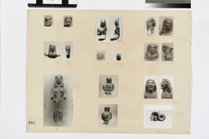 Card base with eighteen photographs attached. The photographs are largely pairs of the same items taken from different angles, except for 1936/02/01/28/13 and 18, and are labelled with the pasted letters a-j. the number 222 is pasted in the lower left corner. Each photograph has a later annotation beside it in pencil, giving bibliographic references. The original description in the catalogue reads: "Terracotta figurines and vases: Protocorinthian and Corinthian. a. Before 700 B.C.; one of the earliest of Corinthian figures. b-d. Protocorinthian: note the painted patterns on the dresses. e-g. Corinthian. h. Vases in the shape of a pomegranate crowned by a lion's head (625-600 B.C.). i. Head of a plastic vase in the shape of a Siren (cf. 234): (600-575 B.C.). j. Top of a plastic vase in the shape of a snake (c. 650 B.C.)."