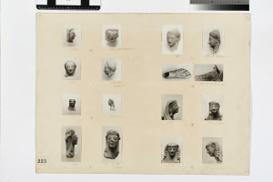 Card base with sixteen black and white photographs attached. They are organised in eight pairs, with each pair consisting of the same item photographed from two angles; the second of each pair has a 2 in pencil to the left of the upper left corner, some of the first of each pair have a 1 but some have been erased. Each pair of photographs is labelled with a pasted letter a-h; the letter b is missing but there is a pale space where it once was. The number 223 is pasted in the lower left corner. Each photograph has a later annotation beside it in pencil, giving bibliographic references. The original description in the catalogue reads: "Terracotta heads (except d): a-c. East Greek (600-500 B.C.). d. Vase in the shape of a sandalled foot (East Greek). e-h. Argive (600-500 B.C.)."