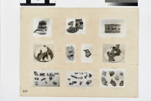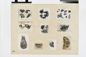 Card base with ten black and white images of pottery and potsherds, labelled with the pasted letters a-j. The number 224 is pasted in the lower left corner. Each photograph has beside it later annotations in pencil, giving bibliographic references. The original description in the catalogue reads: "Corinthian Pottery: d,f. Recomposed cups. g. Scent-vase. h. Lid of a toilet-box, with winged Daemon. i. One of the rare pieces of Corinthian red-figured pottery (c. 400 B.C.). j. Plate, with winged Daemon."