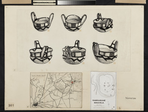 Card base with three images attached, labelled with pasted letters c, a and b. The number 301 is pasted in the lower left corner. "Marmariane" is written in ink in the lower right corner. Each image has beside it a later annotation in pencil giving bibliographic references. The original description in the catalogue reads: "a. Map of North-Eastern Thessaly from Larisa to the Gorge of Tempe. Marmariani lies on the foothills of Olympus, north-west of the gorge. B Marmariani, plan of the Magoúla (prehistoric mound), unto which have been intruded tombs I-V of later date."