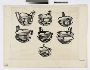 Card base with one item attached, labelled with a pasted d to the left of the lower left corner. The number 302 is pasted in the lower left corner. "Marmariane" is written in ink in the lower right corner. Beneath and to the upper left of the image are later annotations in pencil giving bibliographic references. The original description in the catalogue reads: "Painted Pottery from Marmariani, black on red, with high handles; compare 301c."