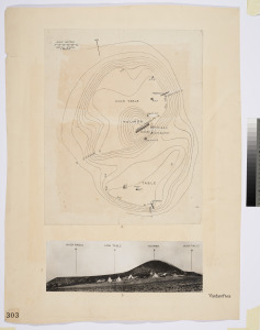 Card base with two image attached, labelled with the pasted letters a and b. The number 303 is pasted in the lower left corner. "Vardaroftsa" is written in the lower right corner. Each image has to the right of is a later annotation in pencil giving bibliographic references. The original description in the catalogue reads: "Vardaroftsa: plan and view of the Magoúla, which is tabular, surmounted by a conical tumulus (toumba) of later date."