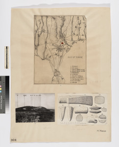 Card base with three images attached, labelled with the pasted letters a-c. The number 304 is pasted in the lower left corner. "H. Mamas" is written in ink in the lower right corner. Each image has beside it a later annotation in pencil, giving bibliographic references. The original description in the catalogue reads: "Map of part of the Chalcidic Peninsula, east of Salonica, showing Hagios Mámas, Molyvopyrgos, and other prehistoric sites. b. Hagios Mámas, view of the Magoúla, showing trial trenches on the slopes of the mound. c. Implements of hard stone, from the Neolithic layer at Hagios Mámas."