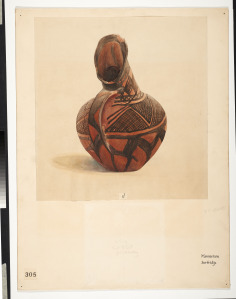 Card base with one image attached, with the pasted label d. The number 305 is pasted in the lower left corner. "Marmariane Serfridje" is written in ink in the lower right corner. To the lower right of the image is a later annotation in pencil giving a bibliographic reference. Below the image is a paler section, with a later annotation in pencil in the centre which reads "305e lent to CUP for WA Heurtley". The original description in the catalogue reads: "Trough-spouted jug (d), from Marmariani: compare the decoration of 301c, 302. e. Painted pot, from Serovinge (Servia), in Western Macedonia, in a quite different style."