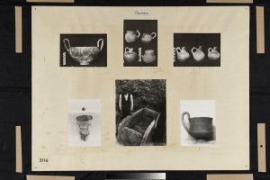 Card base with six black and white photographs attached, labelled underneath with the pasted letters b, a, c-f. The number 306 is pasted in the lower left corner. "Chauchitza" is written in ink on a piece of paper that has been pasted in the centre of the upper edge. Each image has next to it a later annotation in pencil giving a bibliographic reference. The original description in the catalogue reads: "Excavations at Chauchitza, near Lake Doiran in Macedonia: a stratified settlement of the Bronze Age, with Early Iron Age grace on its slopes [Photographed by S. Casson.] a. Bronze Age pottery showing Anatolian influence. b. Iron Age bowl with painted geometrical decoration. c. Iron Age jugs showing survival of Bronze Age forms. d. Bead, gold mouthplate, and bronze amulet, from an Iron Age grave. e. Cist grave built of slabs, in the Early Iron Age cemetery. f. Drinking-cup of typical Iron Age form. g. The Iron Age cemetery, with the settlement mound behind. h. A Bronze Age house floor with store-jars (pithoi) in place." Items g and h described under 306 are actually on item 307 (1936/02/02/07) below.