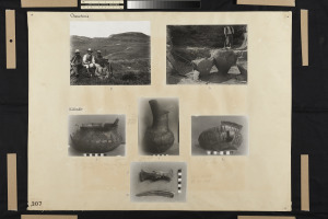 Card base with six black and white photographs attached. The top two have above them the "Chauchitza" written in ink on a separate piece of paper pasted on, and the labels beneath them g and h; the lower four have above them the "Kilindir" written in ink on a separate piece of paper pasted on, and the labels j, i, k, and l and m both next to the final image. The number 307 is pasted in the lower left corner; about half way up on the left side is written in pencil 306. The lower four images have beside them later annotations in pencil giving bibliographic references. The original description in the catalogue reads: "Excavations at Kilindir, a stratified settlement-mound of the Bronze Age. [Photographed by S. Casson.] i. Typical Bronze Age jug, with globular body and trough-spout. j, k. Painted bowls with geometrical decoration. l. Bronze Age axe and (m) sickle of bronze." The descriptions for photos g and h are under the description of 306 (1936/02/02/06) above.