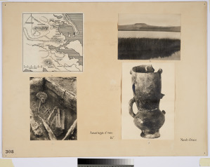 Card base with one map and three black and white photographs attached, labelled with pasted letters a-d. The number 308 is pasted in the lower left corner. "North Greece" is written in ink in the lower right corner. In the lower centre is written in ink "Actual height of vase 16"." Each image has beside it a later annotation in pencil giving a bibliographic reference. The original description in the catalogue reads: "Prehistoric Site at Zerélia (a) Map of North-eastern Greece, to illustrate early cultures in Thessaly. b. The stratified settlement mound at Zerélia, and its lake. c. Cist grave built of slabs, at Zerélia: of the Bronze Age. d. Bronze Age vessel from Zerélia."