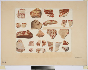 Card base with four pages with water colour illustrations of sherds grouped in the centre. The number 309 is pasted in the lower left corner. "North Greece" is written in ink in the lower right corner. Beneath the lower left corner of the images is a later annotation in pencil giving a bibliographic reference. The original description in the catalogue reads: "Painted pottery, red on white, of the First Neolithic Age, from Zerélia."