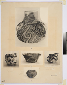 Card base with five images of pottery attached, labelled with pasted letters a-e. The number 310 is pasted in the lower left corner. "North Greece" is written in ink in the lower right corner. Each image has beside it a later annotation in pencil giving a bibliographic reference. The original description in the catalogue reads: "Painted vase, (a) black on red, of the Second Neolithic age, from Rakhmáni near Tempe. b-e. Red on white, of the First Neolithic Age, from Thessalian Sites."