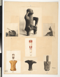 Card base with seven black and white photographs of objects attached, labelled with pasted letters a, b, c, d, -, d, e. The number 316 is pasted in the lower left corner. Above this is written in ink "Actual height in inches a=3 3/4 b=1 4/5 c=2 1/3 d=1 e=2". "Trapeza" is written in ink in the lower right corner. There are later annotations in pencil giving bibliographic references for each image. The original description in the catalogue reads: "Objects from the Cave at Trapeza: (a) Anthropomorphic vase. b. Ivory seal in the shape of a seated monkey: probably Early Minoan II. c. Terracotta figure seated in chair. d. Ivory head with inlaid eyes: probably Early Minoan II. e. Inscribed base of a libation vase: Middle Minoan I."