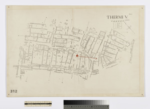 Card base with one print map taking up most of it. The number 312 is pasted in the lower left corner of the image. Below the image is a later annotation in pencil giving a bibliographic reference. The original description in the catalogue reads: "Map of the fifth settlement: of Early Bronze Age, about 2400-2300 B.C., showing fortifications and house-foundations: the red disc shows the point from which the panorama 314d was taken." The panorama is in fact 313d.
