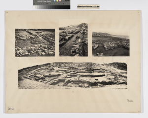 Card bade with four black and white photographs of an archaeological site attached, labelled with the pasted letters a-d. The number 313 is pasted in the lower left corner. "Thermi" is written in ink in he lower right corner. Each image has beside it a later annotation in pencil giving a bibliographic reference. The original description in the catalogue reads: "a. A House-Hearth (Thermi V); with stone foundation covered with potsherds: beyond is an ash-dump. b. Fortifications of the Fifth Settlement: the wide inner masonry is supplemented with outer walls. c. Watch-tower by the north-western gate of the Fifth Settlement. d. Panorama of the Fifth Settlement, showing the southern streets and houses: the circular erections are house-hearths."