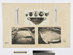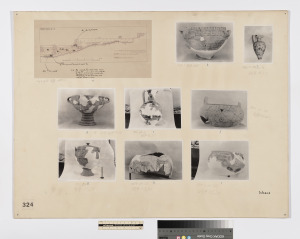 Card base with one print plan and eight black and white photographs attached, labelled with the pasted letters a-i. The number 324 is pasted in the lower left corner. "Ithaca" is written in ink in the lower right corner. Each item has beside it a later annotation in pencil giving a bibliographic reference. The original description in the catalogue reads: "Section of the Aëtos Sanctuary Site (a), showing earlier geometric stratum (before c. 750 B.C.), partly separated by an ancient wall and platform from the later, in which Corinthian influence modifies the peculiar local style. Characteristic vases of successive styles:- b, c. Corinthian imports, (b) geometric: before 800 B.C.: (c) late proto-Corinthian: c. 650B.C. d. Local style: 850-800 B.C. e. Imitation of Corinthian-geometric, but on a very large scale (c. 850 B.C) f. Sub-geometric local style (750-700 B.C.) g. Local fabric, but fine imitation of Corinthian decoration: c. 750 B.C. h. Black-figured technique imitated from proto-Corinthian, but giving totally different effect on so large a scale. i. Closely imitated vases from Afráti in Crete; perhaps a Cretan import: the shape is copied from metal: 700-650 B.C."