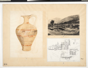 Card base with three image attached, labelled with the pasted letters c, a and b. The number 315 is pasted in the lower left corner. "Plati" is written in ink in the lower right corner. Each image has beside it a later annotation in pencil, giving a bibliographic reference. The original description in the catalogue reads: "Plati… a. View of the excavation (a), with the peak of Mt. Dikte in the distance. b. Plan of the Late Minoan house. c. Late Minoan I vase (c. 1500 B.C.)."