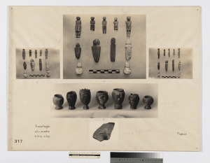 Card base with five black and white photographs of objects attached; labelled with basted letters b, a, c-e. The number 317 is paster in the lower left corner. Diagonally up to the right of this is written in ink " Actual height a,b,c as scales d 1 1/2 in. e 3 in." "Trapeza" is written in ink in the lower right corner. here are later annotations in pencil giving bibliographic references for each image. The original description in the catalogue reads: "a, b, c, Ivory figurines, including a new type with split aprons: Early Minoan II. d. Stone vases: Early Minoan II and III. e. Vase of the new 'Trapeza Ware,' with modelled face."