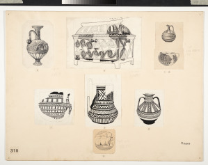 Card base with eight black and white illustrations of objects attached, labelled with pasted letters b, a , c-h. The number 318 is pasted in the lower left corner. "Praesos' is written in ink in the lower right corner. Several of the images have beside them later annotations in pencil giving bibliographic references. The original description in the catalogue reads: "Praisos... a. Larnax (clay burial-chest) with spirited ornament of running spirals in dark red on a buff ground. b. Small amphora: the pairs of double handles are unusual in a vase only 12 inches high. c-g. Geometric pottery. c, d. Jug and bowl from a 'beehive' tomb: (c) is a good instance of the rich effect simply produced in geometric art. f. Probably an imitation of an Attic 'Dipylon' Vase. g. The rayed circles on the neck of the miniature amphora are unusual. h. Minoan gem, found adhering to the mortar of a Hellenistic bathroom. A bull lying in a forest is surprised by a hunter who seizes both its horns. The bull is admirably modelled in the grand Minoan style: by contrast the human figure seems a mere appendage. Drawn by M. Gillièron."
