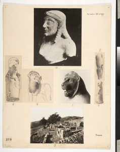 Card base with three black and white photographs and four black and white illustrations attached, labelled a, d, b, c, f, e, g. The number 319 is pasted in the lower left corner. "Praesos" is written in ink in the lower right corner. "The head is 26 in. high" is written in the upper right corner. All the images except g (1936/02/02/19/07) have beside them later annotations in pencil, giving bibliographic references. The original description in the catalogue reads: "Terracottas from the Altar Hill site. a. A male head, heroic or divine, modelled, not cast: it may be as late as the first part of the fifth century. The projection of the chin and its deep depression are unusual. The ears are conventional and, like the falling locks, reminiscent of wood carving. b. Lion, drawing: perhaps as early as the sixth century. c. Lion, photograph: probably mid-fifth century. The leaflike incised work of the body contrasts with the smoothness of the mask: a finely designed head of spirit and originality. d. Female figure (priestess?). e, f. Male figures. The male legs with apron (f) give some idea of the lost body of the 'Young God'. g. Hellenistic building (the 'Almond Tree House'), on the First (Classical) Acropolis. Its dimensions and masonry are large for a private house; probably a public building was subsequently turned into a farm and oil factory."