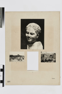 Card base with three black and white photographs attached, labelled with the pasted letters a-c. Between the lower two photos is a 23.2 x 11.4 cm hole with the pasted label d. The number 320 is pasted in the lower left corner. "Paphos" is written in ink in the lower right corner. The upper image and the hole have later annotations in pencil beside them, giving bibliographic references. The original description in the catalogue reads: "a. The Eros of Paphos: a charming head of a laughing boy, three-quarters life-size, now in the British Museum. Perhaps part of a group: c. 350 B.C. b, c. Views of the excavation in progress. d. Plated gold pin, 7 inches long. Finely modelled goats' heads support a large bead of Egyptian faïence surmounted by a peal, separated by cup-like acanthus leaves, flowers and doves. The shaft bears a dedication of Euboulê to Paphian Aphrodite."