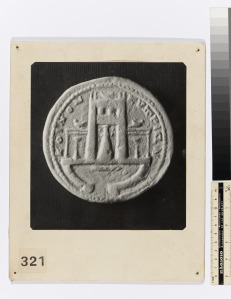 Card base with one black and white photograph. The number 321 is pasted in the lower left corner. The original description in the catalogue reads: "Roman bronze coin of Paphos, very much enlarged, showing the façade of the Temple of the Paphian Goddess."