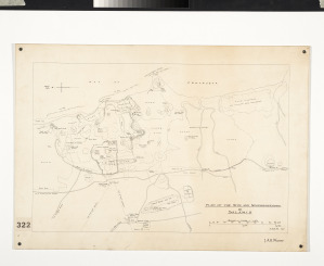 One black and white ink map, titled "Plan of the Site and Neighbourhood of Salamis". Below the title is a scale bar showing 11 inches = 1 mile. There is a border around the plan; outside the border in the lower left corer is pasted the number 322, and in the lower right corner is written in ink "J.A.R.Munro". In faint pencil along the bottom edge is the later annotation "can't find". There is a reinforced hole in each corner. The original description in the catalogue reads: "Map of Salamis, showing excavated areas."