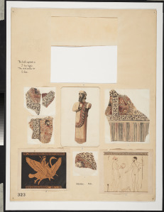 Card base with seven colour illustrations, with the pasted labels -, c, b, c, d, c, e. Above is a 25.5 x 25.3 cm hole where an image has been removed, with the pasted label a. The number 323 is pasted in the lower left corner. "Salamis. Poli." is written in ink in the lower centre. To the left of the hole is written in ink "The bull capital is 3 feet high: The statuette is 2 feet.". Above this is a later annotation in pencil which reads "Can't find any of this". The original description in the catalogue reads: "a. Marble capital with projecting head of a winged bull, reminiscent of Persian palace-architecture, found in the Agora at Salamis, now in the British Museum. b. Statuette of painted terracotta, now in the British Museum. c. Fragments of larger statues, of the same fabric, with elaborately patterned robes. POLI... d. Aphrodite riding on a swan: Attic lekythos, about 440 B.C. attributed to the 'Achilles painter': found in a tomb at Poli. Now in the Ashmolean Museum, Oxford. e. Arming a warrior, on a white Attic lekythos. Found in the same tomb Now in the British Museum."