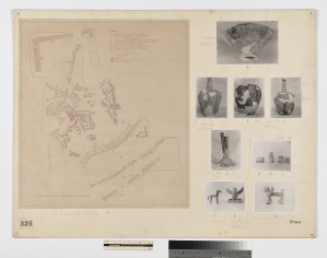 Card base with one print plan and eight black and white photographs attached, labelled with the pasted letters a-k: g-i are all beside a single image (1936/02/02/25/07), while k appear twice, once alongside j (1936/02/02/25/08) and once alone (1936/02/02/25/09). The number 325 is pasted in the lower left corner. "Ithaca" is written in ink in the lower right corner. Each item has beside it a later annotation in pencil giving a bibliographic reference. The original description in the catalogue reads: "(a) Plan of the site. b. Corinthian import, but on unparalleled scale: 750-700 B.C. c-e. Local ware: unique in shape and decoration; inspired by proto-Corinthian and early-orientalizing models: 750-700 B.C. f. Vase of unusual 'candlestick' shape, perforated throughout: the latest local fabric: signed by the maker, Kalikleas: 700-675 B.C. g-i. Ivories: c. 800-600 B.C.: (g) frog; (h) monkey with child; (i) couchant ram. Compare those from the Orthia Sanctuary at Sparta. j, k. Bronzes: (j) horse: 900-700 B.C.; (k) sphinx: very early orientalizing; the type with outspread wings is very rare in Greek art: c. 750-700 B.C."