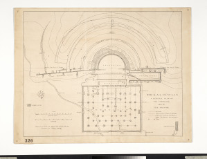 Ink map titled "Megalopolis A General Plan of the Thersileion and of the Theatre" in the lower right. Beneath the title is a key for the different lines drawn on the map. In the lower left there is a compass, scale bars, and the names of the drawers. There is a border around the map; the number 326 is pasted in the lower left corner outside this border. In the upper right corner outside the border is a later annotation in pencil giving a bibliographic reference. The original description in the catalogue reads: "Map of the site of Megalopolis, showing the Walls, Theatre, Assembly Hall and other buildings."