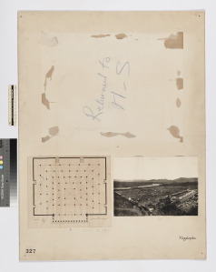 Card base with two images attached, with the pasted labels b and c. Above is a space with pieces of card stuck around the edge, with "Returned to H-S" written sideways in blue pencil and the pasted letter a beneath. The number 327 is pasted in the lower left corner. "Megalopolis" is written in ink in the lower right corner. One of the images (1936/02/02/27/01) has beneath it a later annotation in pencil giving a bibliographic reference. The original description in the catalogue reads: "View of the theatre and assembly hall (Thersileion) (a) from the top of the auditorium. The colonnade of the Thersileion serves as background to the stage. Beyond the river is the Agora, with excavated foundations of the Colonnade of Philip of Macedon, and the sanctuary of Zeus the Saviour by the river bank. b, c. Plan and view of the Thersileion, its inner and outer ranges of columns are spaced radially, to give the assembly clear view of the speakers in the midst."