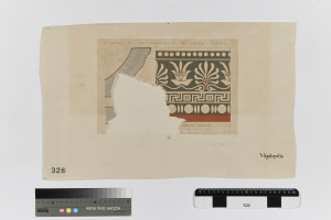 Card base with one coloured print attached, with the pasted label b. At the top of the base is a pasted a: the upper part of the original base has been removed. The number 327 is pasted in the lower left corner. "Megalopolis" is written in ink in the lower right corner. Beneath the image is a later annotation in pencil, giving a bibliographic reference. The original description in the catalogue reads: "View of the Theatre from the stage a, the first row of seats is provided with backs , on which are inscribed names of tribes and of the dedicator, Antiochos. b. Coloured cymatium moulding from the portico of the Thersileion, reconstructed; almost the only bit of ornament found."