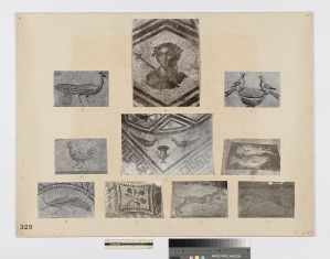 Card base with ten black and white photographs of mosaics attached, labelled with the pasted letters b, a ,c-j. The number 329 is pasted in the lower left corner. The original description in the catalogue reads: "Mosaic with medallion heads of Pan, Silenus, Satyrs and (a) Maenads; with subsidiary designs (b) peacocks, (c) doves, (d) a cock, (e) parrots, and (f) fish. Mosaic with a central medallion of Dionysos and complementary designs: (g) a peacock, (h) flowers, and (i, j) dogs hunting goats."