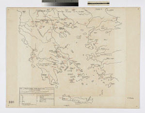 Card base with one map attached. The number 330 is pasted in the lower left corner. "O. Davies" is written in ink in the lower right corner. The original description in the catalogue reads: "Map of ancient mines in the Aegean, compiled by Oliver Davies, Student of the School, 1926-30."