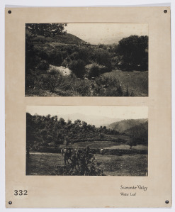 Card base with two black and white photographs attached. The number 332 is pasted in the lower left corner. "Scamander Valley Walter Leaf" is written in the lower right corner. There are erased later annotations giving bibliographic references partly visible to the top right of each image. The original description in the catalogue reads: "Scenes in the Skamander Valley: the lower near Karakeui showing Kotylos from the north. Photograph by the late Walter Leaf."