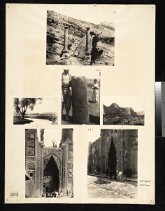 Card base with six black and white photographs attached, labelled with pasted letters a-f. The number 333 is pasted in the lower left corner. "D.G. Hogarth" and "J. A. R. Munro"are written in the lower right corner. Framed. The original description in the catalogue reads: "a. Roman bridge over the Euphrates, near Kiakhta. b. Geuksun, the ancient Cocussus, in Cappadocia, the place of St John Chrysostom's exile, A.D. 404-407. c. Palanga: lower half of draped statue with incised inscription: now in Constantinople Museum. d. Tokat, the ancient Dazimon, in Pontus, with Byzantine castle. e, f. Sivas, the ancient Sebasteia, formerly Pompey's colony Megalopolis, in Pontus. The 'Blue College' (e) and another college (f) were built under the later Seljuk rulers, about 1272 A.D. The beautiful decoration of the gates is in white marble and glazed brick, mostly blue."