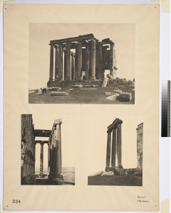 Card base with three black and white photographs attached, labelled with the pasted letters a-c. The number 334 is pasted in the lower left corner. "Aezani F.W. Hasluck" is written in ink. The original description in the catalogue reads: "Temple of Zeus at Aezani, Phrygia, a great building of early imperial date, in Ionic style, on an imposing platform: (a) S.E. front; (b) S.W. colonnade; (c) isolated columns in S.W. colonnade."