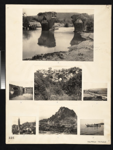 Card base with seven black and white photographs attached, labelled with pasted letters a,b,d,c,f,e,g. The number 335 is pasted in the lower left corner. "Asia Minor. F.W. Hasluck" is written in ink in the lower right corner. To the right of image a is a later annotation in pencil giving a bibliographic reference. Framed. The original description in the catalogue reads: "(a) Bridge over the Aisepos; three and a half miles from its mouth on the Sea of Marmara; not recorded before. The central piers have lost their arches, but the abutments are well preserved. b. Bridges of Justinian over the Sangarios: a great structure of nine arches: the roadway is absolutely horizontal. In 1908 the bridge was passable though the roadway was in bad repair. The semi-circular defensive spurs should face up-stream, but when photograph (b) was taken the current was creeping the other way. c. In the second photograph the bed is dry. d. City gate of Cyzicus, in the N. wall near the amphitheatre. The figure in the archway is F.W.H. e. Afium Kara Hissar, Vilayet of Brusa. The citadel is an abrupt mass of rock 400 feet high: many prints from this negative were given during the war to families whose officer relatives were imprisoned in the castle. f. Adalia. A walled mediaeval town on the Caramanian coast, garrisoned for twelve years by the Frank Kings of Cyprus. g. Blessing with nets at the beginning of the fishing season in the Marmara Islands. The Black objects held up are the nets: the pappas (priest) is in the centre: the boats have remarkably graceful lines."