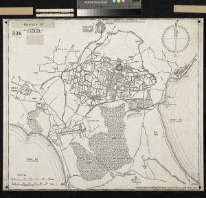 One black and white ink map titled "Survey of Cyzicus"; "survey of" has been written on a separate piece of paper that has been pasted on, and there is another pasted rectangle, blank, underneath the title. There is a compass in the upper right corner and a scale bar in the lower left corner. The creator and assistant's names are in the lower right corner. The number 336 is paster in the upper left corner; and is written and circled in pencil to the left of the compass. Along the lower left side there is a later annotation in pencil giving a bibliographic reference. There is a reinforced hole in each corner. The original description in the catalogue reads: "Plan of ancient Cyzicus, made by A.E. Henderson (student 1897-8), in connexion with Hasluck's exploration of this site."