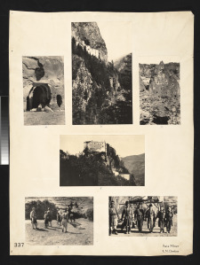 Card base with six black and white photographs attached, labelled with pasted letters a-f. The number 337 is pasted in the lower left corner. "Asia Minor R.M. Dawkins" is written in ink in the lower right corner. Framed. The original description in the catalogue reads: "a. Rock-cut church, near Sinassos in Cappadocia. These and rock-cut dwellings are characteristic of this region. c. Rock-cut dwellings in the Soghanlu Valley in Cappadocia. b. The monastery of Panagia Soumela: the treasures of this deserted monastery are at Athens. d. The Monastery of St George Peristerona at Pharasa, a Greek village in the Taurus, where a curious dialect was spoken. There were in the village only a very few Turks. e, f. Threshing floor and Greek children."