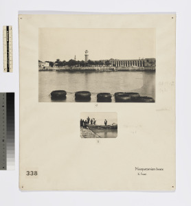 Card base with two black and white photographs attached, labelled with the pasted letters a and b. The number 338 is pasted in the lower left corner; the same can faintly be seen written in pencil and circled above this. "Mesopotamian boats K. Frost" is written in ink in the lower right corner. To the right of each image is a later annotation written in pencil, giving a bibliographic reference. Below the upper annotation is the word "unpublished??" written and crossed out in pencil. The original description in the catalogue reads: "Boats on the Tigris and Euphrates. (a) The Kufa boats at Bagdad are circular, are made of skins, and are broken up at their journey's end; exactly as noted by Herodotus (I, 194) in the fifth century B.C. b. A Shahtor boat on the Euphrates. The figure in the boat is K. T. Frost.”