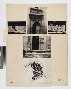 Card base with four black and white photographs and one map attached, labelled with pasted letters c,a,d,b,e. The number 345 is pasted in the lower left corner. "Chios F.W.Hasluck" is written in ink in the lower right corner. Beside the images are later annotations in pencil giving bibliographic references. The original description in the catalogue reads: "Monuments in Chios: a. Relief on lintel of church at Chalkios: the Entry into Jerusalem, flanked by the Giustiniani arms. b. Lower part of the same doorway. c. Armorial bearing in the Museum of Chios: the central shield is that of Genoa. d. S. George killing the dragon."
