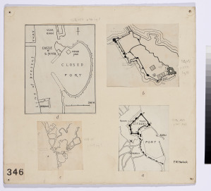 Card base with four black and white ink maps/plans attached, labelled with the pasted letters d,b,c,a. The number 346 is pasted in the lower left corner, "F.W.Hasluck" is written in ink in the lower right corner. Beside each image is a later annotation in pencil giving a bibliographic reference. The original description in the catalogue reads: "Maps and plans: a. Plan of the citadel of Chios. b. Mytilene, Castle of the Gattelusi. c. Aenos, superseded as a port by Alexandropolis (Dede-agatch) owing to change in the course of the river Maritza (Hebros). d. Smyrna, Castle of St. Peter: owned by the Knights of Rhodes till its destruction by Timur in 1399. The port has long since silted up."