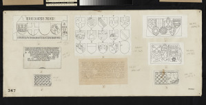 Card base with eight black and white illustrations attached, seven in ink and one in pencil, labelled with pasted letters a-h. The number 347 is pasted in the lower left corner. "F.W.Hasluck" is written in ink in the lower left corner. Beside each image is a later annotation in pencil giving a bibliographic reference. The original description in the catalogue reads: "Armorial bearings and inscriptions: a. Chios: armorial bearings: Giustiniani, City of Genoa [erased], de Marchi. b. Amastra: Genoese arms. c. Smyrna: Arms: de Heridia, the Order of St. John (the cross defaced by Turks), the Papacy, d'Allemagna. d. Chios: Inscription, in Genoese dialect (as it applied to sailors and harbour-loafers), prohibiting the throwing of filth or ballast into the harbour. e. Smyrna: Arms; Papacy, d'Allemagna. f. Chios. Inscription respecting the ownership of a chapel by Genoese residents. g, h. Aenos; arms of the Gattelusi."