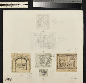 Card base with six black and white illustrations attached, 2 pencil and four ink, labelled with the pasted letters a-f. The number 348 is pasted in the lower left corner. "F.W.Hasluck" is written in ink in the lower right corner. Neat the centre of the left edge is written in faint pencil 348 in a circle, and to the right of this "add a letter d" with an arrow pointing to the lower right. Beside each image is a later annotation in pencil giving a bibliographic reference. The original description in the catalogue reads: "Armorial bearings, sarcophagus and marble capital: a. Chios: arms of Maruffo. b. Chios: part of a lintel relief: demi-angel (Giustiniani crest). c. Aenos: Acropolis (W. tower): Gattelusi arms. d. Chios: sarcophagus: Giustiniani arms. e. Galata: relief: arms of Doria, the City of Genoa, and de Merude. f. Chios: marble capital."