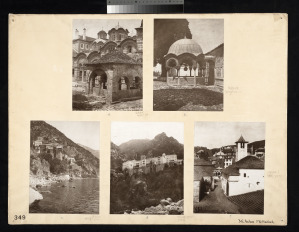Card base with five black and white photographs attached, labelled with pasted letters a-e. The number 349 is pasted in the lower left corner. "Mt Athos F.W. Hasluck" is written in ink in the lower right corner. Beside each image is a later annotation in pencil, giving a bibliographic reference. Framed. The original description in the catalogue reads: "a. Chiliandari Monastery: well-house and church. b. Laura Monastery: well-house. c. Hagios Dionysios Monastery: from the seashore. d. Hagios Pavlos Monastery: from below. e. Vatopedi Monastery: court with bell-tower. Photographs by the late F. W. Hasluck."