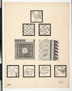 Card base with nine black and white ink illustrations attached, with the letters a-i written in pencil to the top left corner. The number 350 is pasted in the lower left corner. "Theotokou J.P.Droop" is written in ink in the lower right corner. Each image has beside it later annotations in pencil, giving bibliographic references. The original description in the catalogue reads: "Mosaic pavements from a Byzantine church at Theotokou in Thessaly. These mosaics consist mainly of birds, flowers and geometrical designs. The patterning is good, and some of the birds, notably the hen correcting her chicken, are designed with point and humour. On the evidence of coins found in the course of the excavations the church cannot be later than 570 A.D. The mosaics, which are late Roman rather than early Christian in style, can be assigned to the 5th century (excavated by A.J.B. Wace and J.P Droop)."