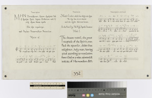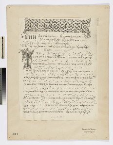 Card base with one black and white print attached. The number 351 is pasted in the lower left corner. "Byzantine Neume H.J.W. Tillyard" is written in ink in the lower right corner. The original description in the catalogue reads: "A Byzantine musical manuscript at the Monastery of Grottaferrata, near Rome: Codex Cryptensis, E. L. II, f. 38b. It contains the Idiomela or Proper Hymns for the fixed days of the Calendar of the Greek Orthodox Church. The original MS. was written about 1280 in a well-formed, clear, but rather stiff, hand, with neumes of the best style of the Round or Middle Byzantine Notation. Afterwards the MS. fell to pieces and many leaves were lost. It was rebound in the 15th century and the missing leaves replaced by copies in a 15th century hand. The page here shown belongs to this second hand. A few variants to the music have been added, either by the same or by a somewhat later, but still 15th century, hand. (photograph by H.J.W. Tillyard)."