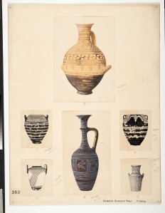 Card base with four black and white and two colour illustrations of pottery attached, labelled with the pasted letters a,c,b,d-f. The number 353 is pasted in the lower left corner. "Knossian Geometric Vases. M. Hartley" is written in ink in the lower right corner. Each image has beside it a later annotation in pencil giving a bibliographic reference. The original description in the catalogue reads: "Early Greek vases from Crete: a. Geometric pitcher from Episkopi. b. Early orientalizing jug from Fortezza near Knossos. c-f. Other geometric jars. (Miss M. Hartley)."