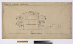 BRF 01/01/07/034. Ink and pencil illustration of the section of a church. Title in upper left reads "Church of the Holy Apostles: Thessalonica"; smaller title in lower centre reads "Longitudinal section looking north." "No 3" is written in ink in the upper left corner. There are two scale bars, one for feet on the lower left and one for metres on the lower right. Above the right-hand scale bar is a Byzantine Research Fund copyright stamp with the original archive number written in. The original description in the catalogue reads: " The Church of the Holy Apostles. - Section, looking north."