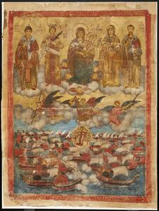 A painting showing a naval battle at the bottom with saints and angels above. The original description in the catalogue reads: "Painting on vellum, the Battle of Lepanto. Lent by Sir Arthur Evans." This is now part of the BSA Art Collection (BSA/AC/P/1/36). The painting is attributed to Dimitri Pelekasi. A copy of an orginal by Georgiou Klontza done in the 16th century.