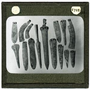Part of a group of images from the British School at Athens excavations at Palaikastro, Crete in the 1902-1905. The original description in the SPHS negative register reads: "Palaikastro: bronze objects".